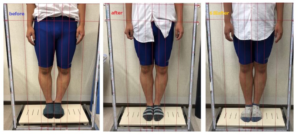 after(同年6月後半、3回施術後撮影)ではちゃんと膝が正面に向き、太ももがくっつき仕上げまであと少しでした。